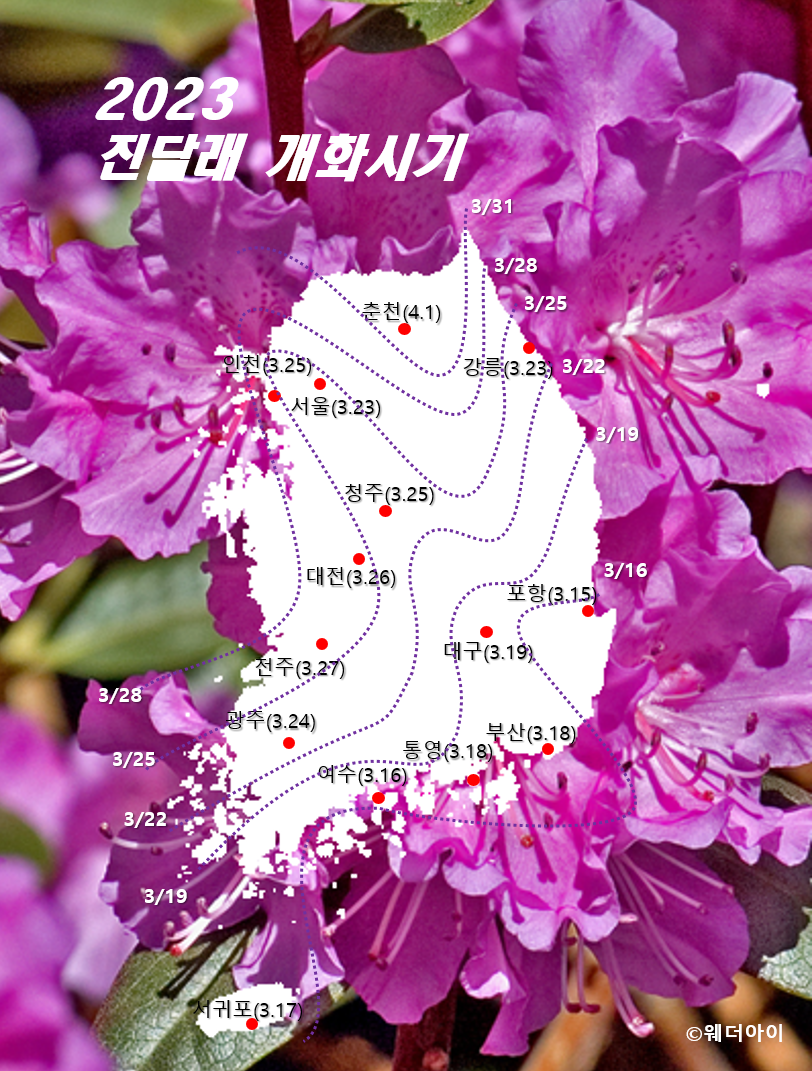 진달래꽃은 우리나라 전역에서 볼 수 있는 봄꽃의 대명사이기도 합니다. 19 부산과 대구에서 개화가 시작됩니다.