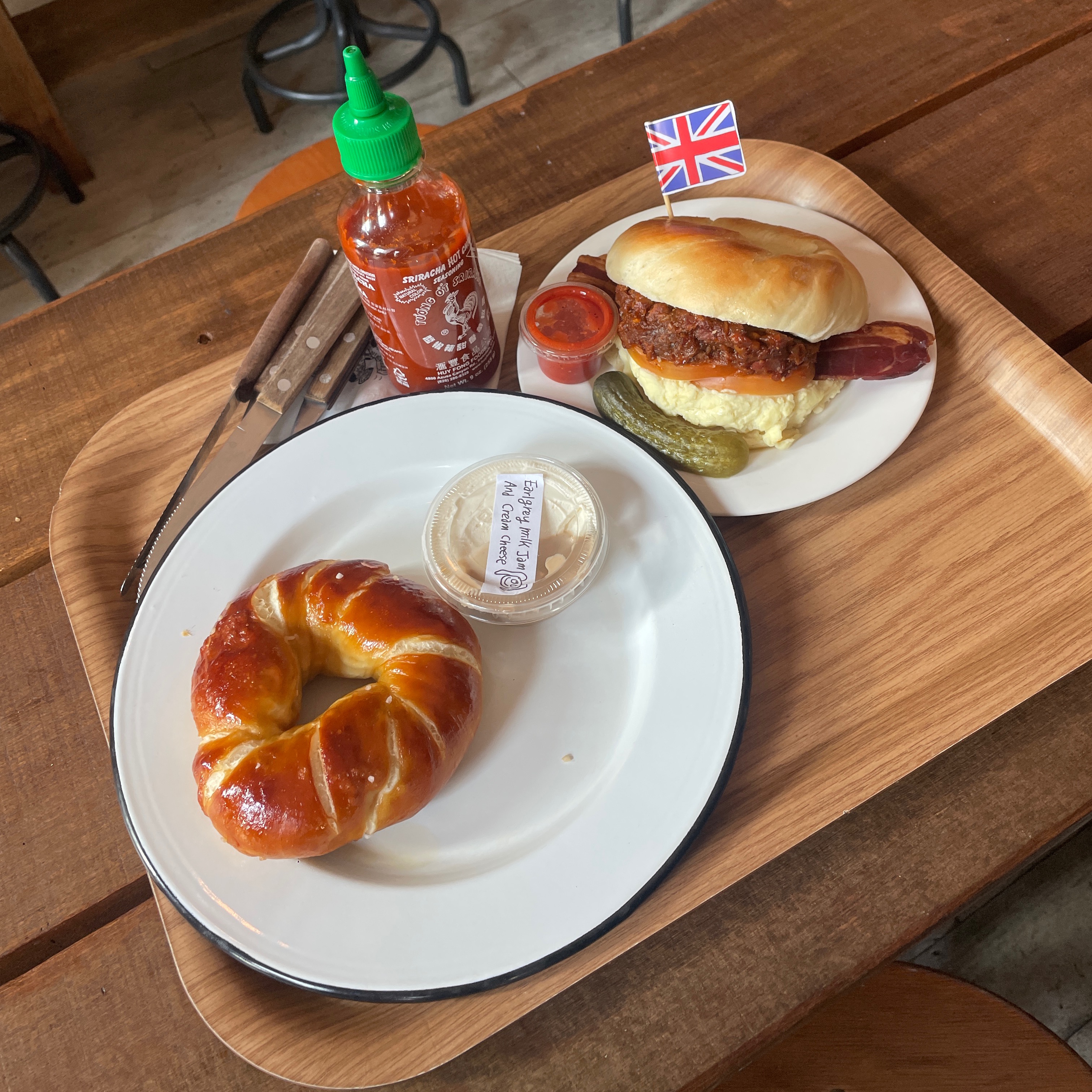 프레첼 베이글, 베이컨 포테이토 샌드위치, 얼그레이 잼 크림치즈를 주문했어요!