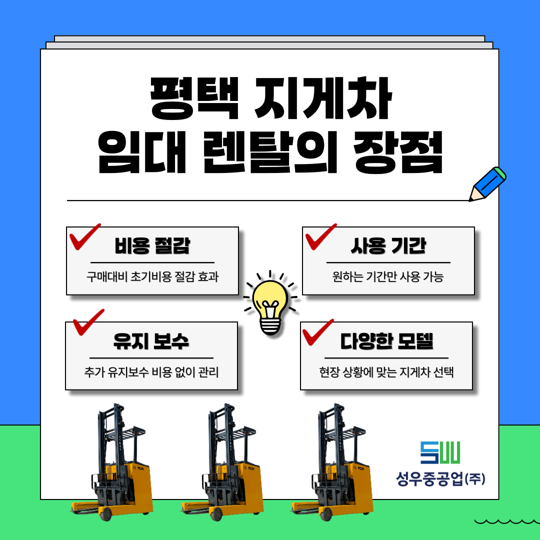 평택에서 지게차를 렌트하면 어떤 장점이 있나요? 1. 초기 비용 절감 지게차를 직접 구매하는 경우 초기 투자 비용이 높을 수 있습니다. 반면, 렌탈의 경우에는 정기적인 월 사용료만 지불하시면 되기 때문에 초기 자본 부담 없이 바로 작업을 시작하실 수 있습니다. 특히, 짧은 기간 동안 사용해야 하는 경우에는 렌탈이 훨씬 경제적입니다.2. 장기렌탈로 더 큰 비용 절감 장기렌트를 선택하시면 월렌탈 비용이 더 저렴해집니다. 장기 프로젝트나 지속적인 이용을 고려하고 계시다면 1년 이상 장기 임대 계약을 체결하시면 월 비용을 대폭 절감하실 수 있습니다.3. 유지보수 및 수리 포함 렌탈 서비스에는 정기 유지보수 및 애프터 서비스가 포함됩니다. 장비에 문제가 발생하더라도 추가 비용 없이 즉시 수리가 가능해 예산을 체계적으로 관리할 수 있습니다.